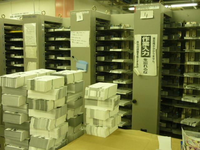 製本機の棚へ、ページごとにまとめられた原稿を置いていきます。