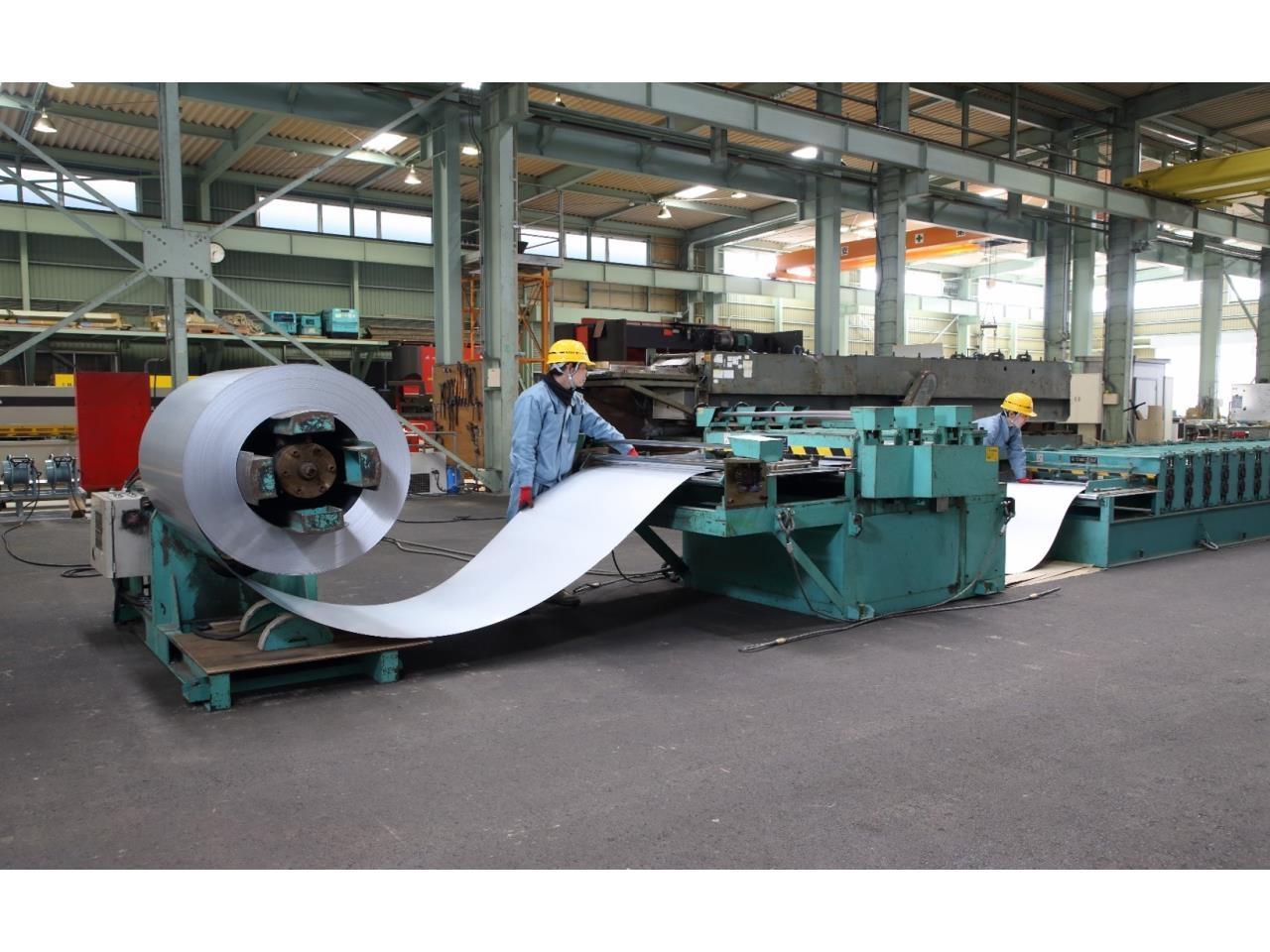 薄鉄板(1mm以下)を専用のロール成型機やプレス機にて建築資材(屋根材・壁材)に加工します。 |